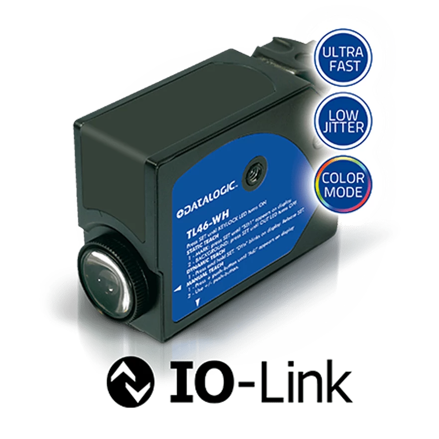 Datalogic ultra nagy sebességű optikai kontraszt érzékelő, 70 kHz kapcsolási frekvencia, 3us jitter Sn:12 mm, Beállító gomb 4 LED, Kijelző, IO-Link PP/PNP/NPN, vertikális LED R.G.B fény, TL46-WH-815-PZ