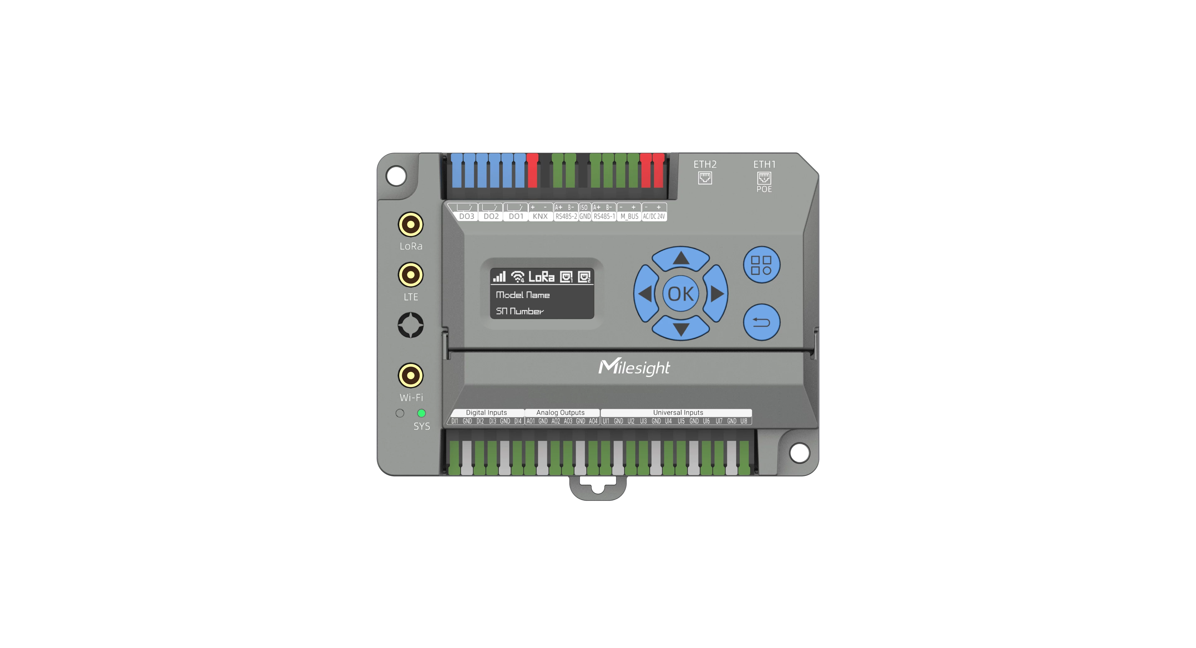 A helyszíni diagnosztikát a beépített 1,3 hüvelykes OLED kijelző és a fizikai gombok támogatják, így a mérnökök laptop nélkül is ellenőrizhetik a rendszer állapotát és a hálózati stabilitást. Az NFC technológia segítségével a Milesight szenzorok párosítása pillanatok alatt elvégezhető, ami drasztikusan felgyorsítja a rendszerbe állítást.