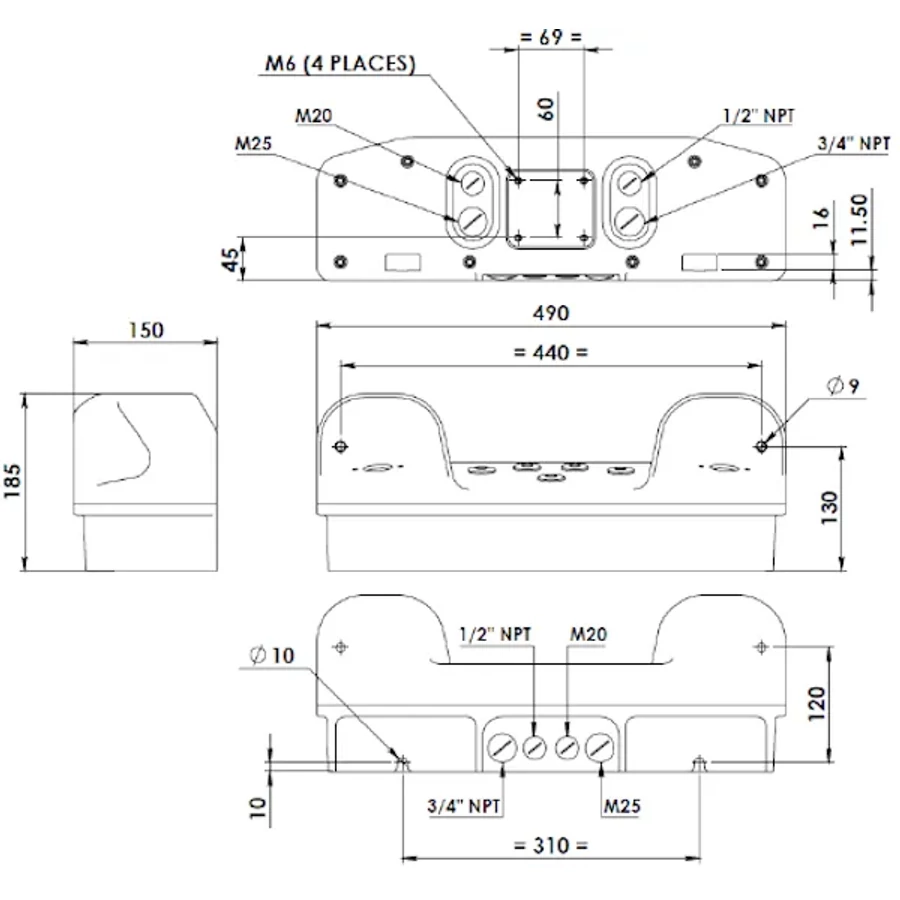 Kábelbevezetések 2 x M20 2 x M25 2 x ½ ”NPT 2 x ¾” NPT