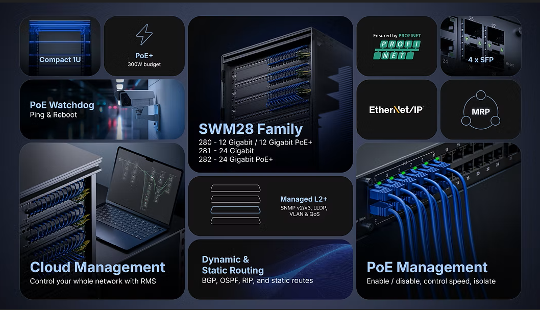 Minden menedzselhető switch, mint a TSW202 vagy a nagy sűrűségű SWM28-széria, a Teltonika intuitív TswOS operációs rendszerét használja. Ez a felület teszi lehetővé, hogy a switch minden egyes portja egyedileg konfigurálható legyen (sebességkorlátozás, izoláció, PoE-kezelés).