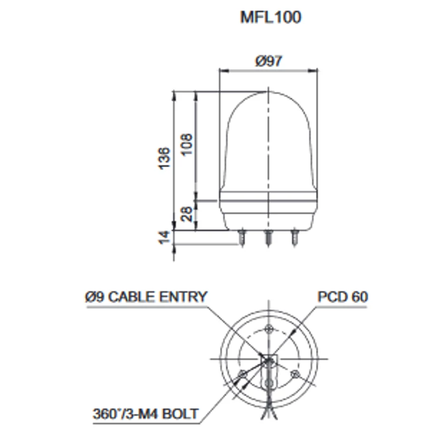 MFL100 LED Multifunkciós fényjelző, állandó/villogó/stroboszkóp/forgó fény piros DC12-24V, IP65