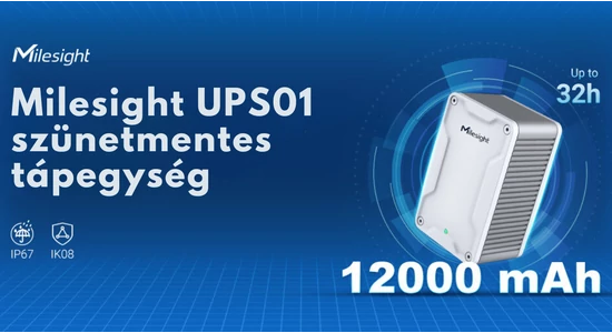 A Milesight UPS01 szünetmentes tápegység egy újratölthető, 12000 mAh kapacitású akkumulátor, mely áramkimaradás esetén akár 32 óráig is fenn tudja tartani a megtáplálást. A teljesítmény a megtáplált eszköz szerint változhat.