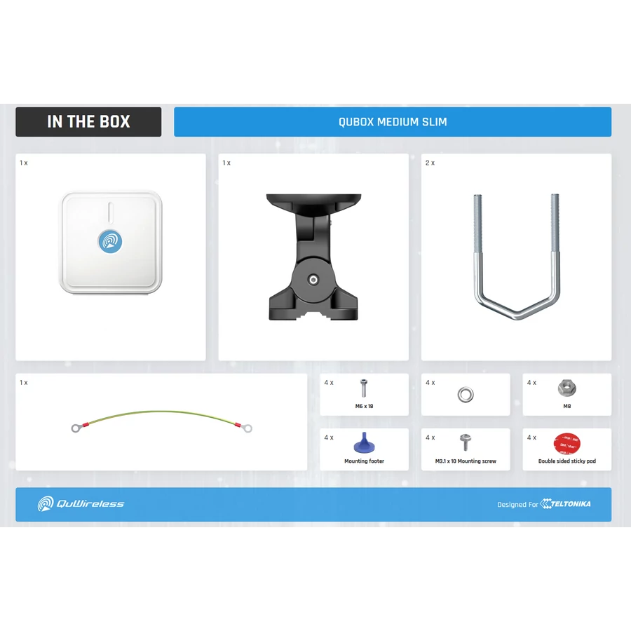 A QuBox Medium Slim esztétikus kialakítása alkalmassá teszi arra, hogy akár látható helyeken is telepítsék, például köz- vagy közigazgatási épületekben (hotspotként). A rendszert kültéri használatra tervezték, az IP67 vízállósági szintet speciális tömítőrendszer biztosítja, ami ellenállóvá teszi bármilyen időjárási körülménnyel szemben. A QuBOX Medium Slim lapos teteje további eszközök, például körsugárzó antennák rögzítésére szolgál, továbbá 4 további furat is található, amelyekbe akár 4 további antenna is felszerelhető az alján. A QuBOX Medium Slim üvegszálas WiMount rögzítőrendszerrel érkezik. A rendszer a QuWireless kínálatából bármely olyan antennalappal megrendelhető, amely kompatibilis ezzel a doboztípussal.