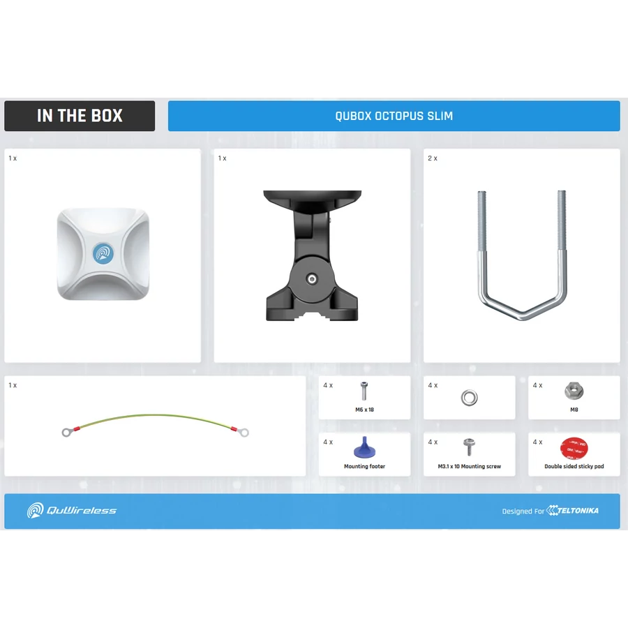A QuBox Octopus Slim tokozat esztétikus kialakítása alkalmassá teszi arra, hogy akár látható helyekre is telepítsék, például középületekbe/közigazgatási épületekbe. A rendszert kültéri használatra tervezték, az IP68-as vízállósági szintet speciális tömítőrendszerrel érték el, ami ellenállóvá teszi bármilyen időjárási körülmények között. A QuBOX burkolat lapos teteje további eszközök, például körsugárzó antennák felszerelésére szolgál, ezen kívül 4 további furat is található, amelyekbe akár 4 másik antennát is fel lehet szerelni az aljára. A QuBOX ház üvegszálas WiMount rögzítőrendszerrel érkezik. A rendszer bármilyen, a QuWireless kínálatában szereplő antennapanellel megrendelhető, amely kompatibilis ezzel a doboztípussal.