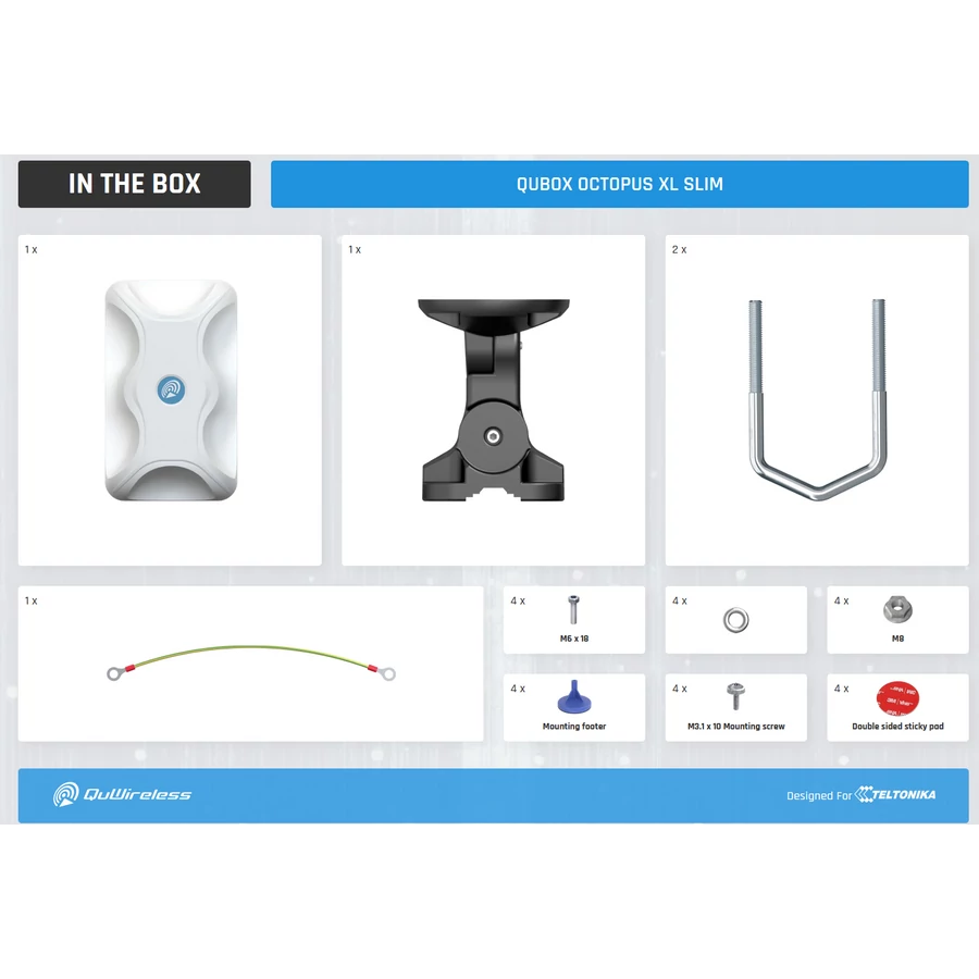 A QuBox Octopus XL Slim tokozat esztétikus kialakítása alkalmassá teszi arra, hogy akár látható helyekre is telepítsék, például középületekbe/közigazgatási épületekbe. A rendszert kültéri használatra tervezték, az IP68-as vízállósági szintet speciális tömítőrendszerrel érték el, ami ellenállóvá teszi bármilyen időjárási körülmények között. A QuBox lapos teteje további eszközök, például körsugárzó antennák felszerelésére szolgál, ezen kívül 4 további furat is található, amelyekbe akár 4 másik antennát is fel lehet szerelni az aljára. A QuBOX burkolat üvegszálas WiMount rögzítőrendszerrel érkezik. A rendszer bármilyen, a QuWireless kínálatában szereplő antennapanellel megrendelhető, amely kompatibilis ezzel a doboztípussal.