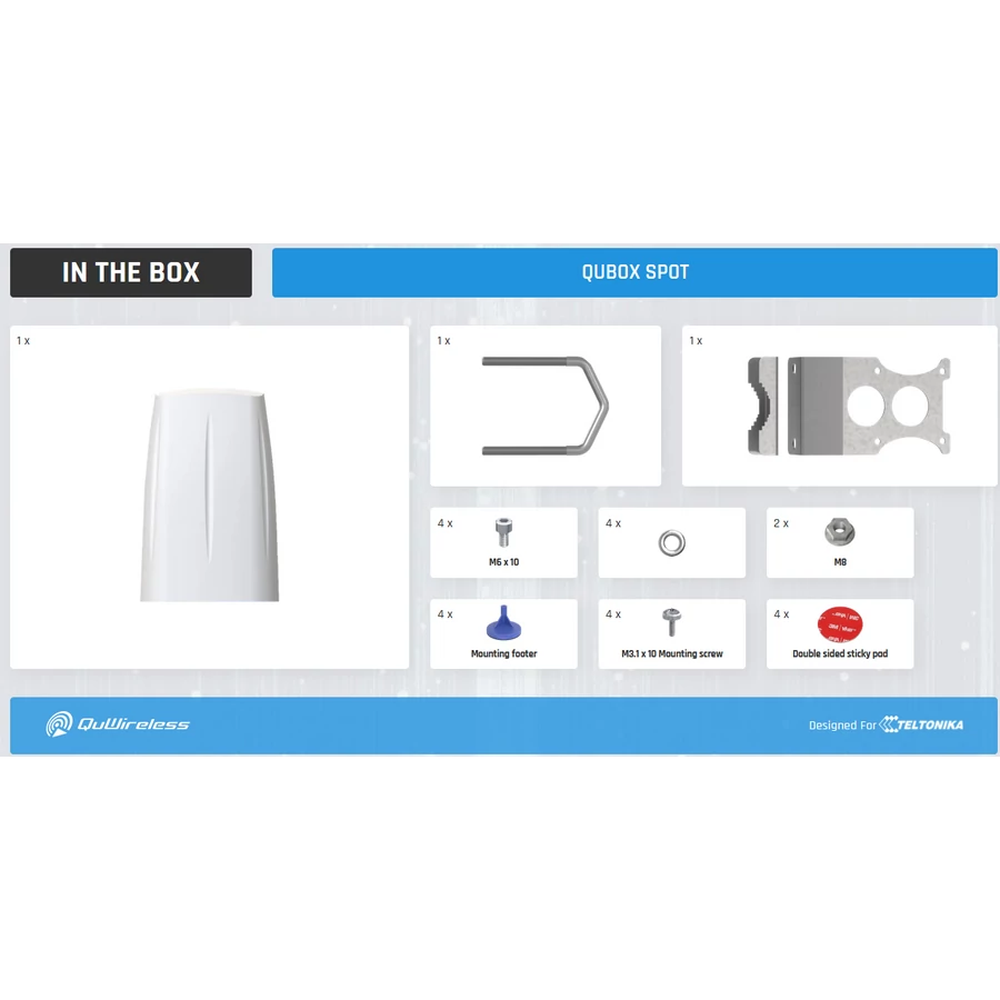A QuBox Spot egy csúcskategóriás IP68-as tokozat beltéri és kültéri használatra. Hotspotok vagy más elosztórendszerek létrehozására tervezték, kiváló alap a többirányú antennákhoz, valamint mozgó járműveken történő telepítésekhez. A QuBox Spot beépített szerelőrekesszel rendelkezik (méretek 113 x 113 x 50 [mm]). A tokozat árbocra, falra vagy sík felületekre, például járművek tetejére is felszerelhető. A ház ABS műanyagból készült.