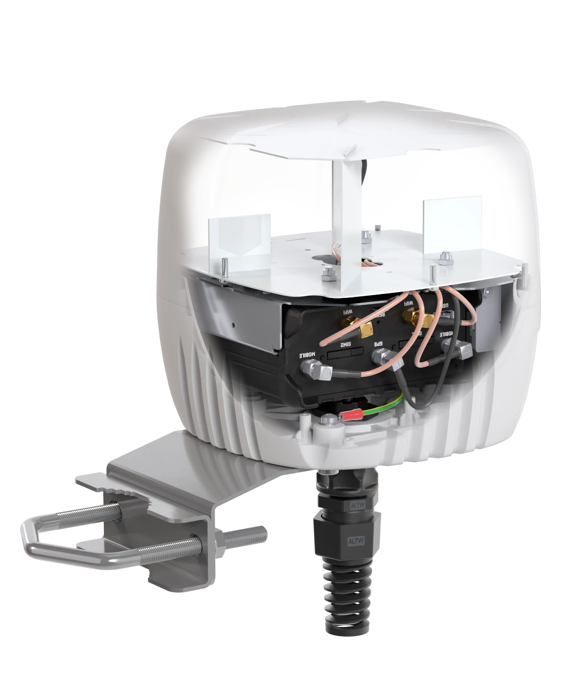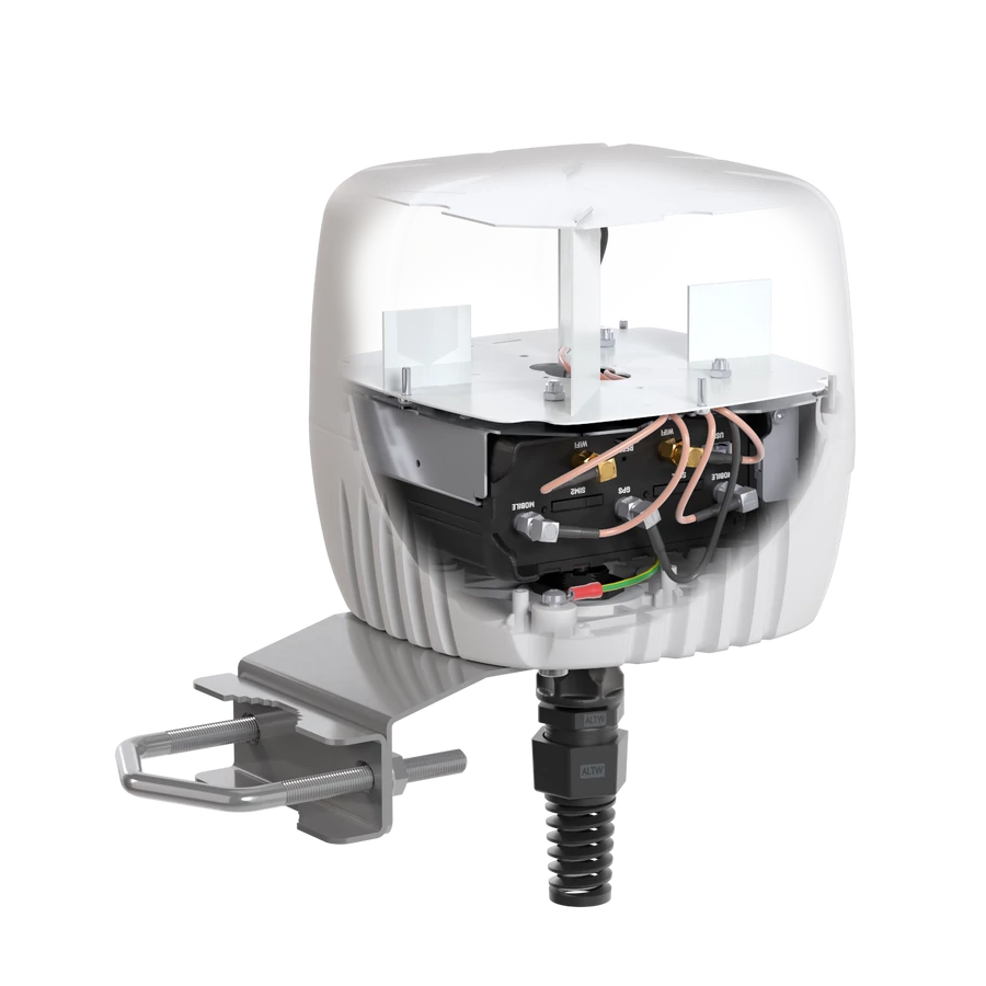 Teljes integráció: Beépített többsávos LTE & 5G körsugárzó antenna, Wi-Fi antenna és GPS antenna, valamint hely a Teltonika RUT955/RUT956/RUT906 routerek számára – mindez egyetlen kompakt egységben.