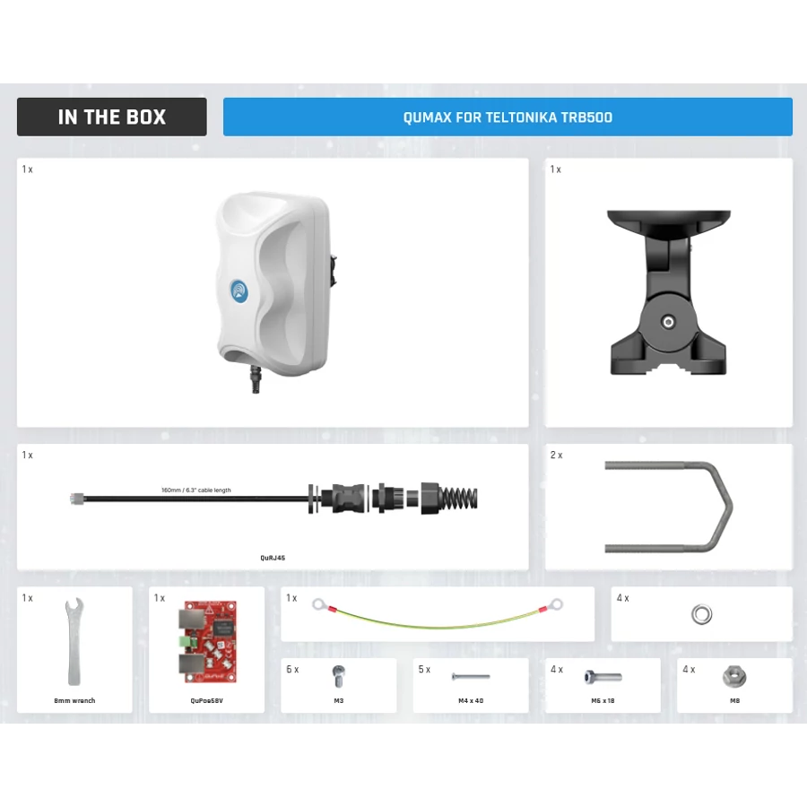 A QuMax A500M egy nagyteljesítményű irányított MIMO 4x4 LTE és 5G antenna (4x SMA csatlakozóval) Teltonika TRB500 átjárókhoz. Az antenna széles frekvenciatartományt fed le, 617 MHz (Band71) és 6.0 GHz között. Az 5G mellett GPS antennát is tartalmaz, ami azt jelenti, hogy a QuMax A500M által egy "minden az egyben" megoldást kap TRB500 készülékéhez. A ház belsejében található router szerelési hely segítségével számos új kültéri (IP67) megoldás valósítható meg. Javasoljuk akár mozgó alkalmazásokhoz is, például vidéki területeken a jelminőség javítására. 7 dBi erősítést és széles sugárszélességet kínál, így városi és vidéki környezetben egyaránt használható.