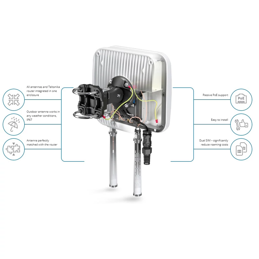 Minden egyben! IP67 Kültéri Integrált, többsávos, nagyteljesítményű LTE irányított antenna + kültéri Wi-Fi omni antenna + GPS antenna + Tokozat telepítési hellyel Teltonika RUT956/RUT955 routerkhez.