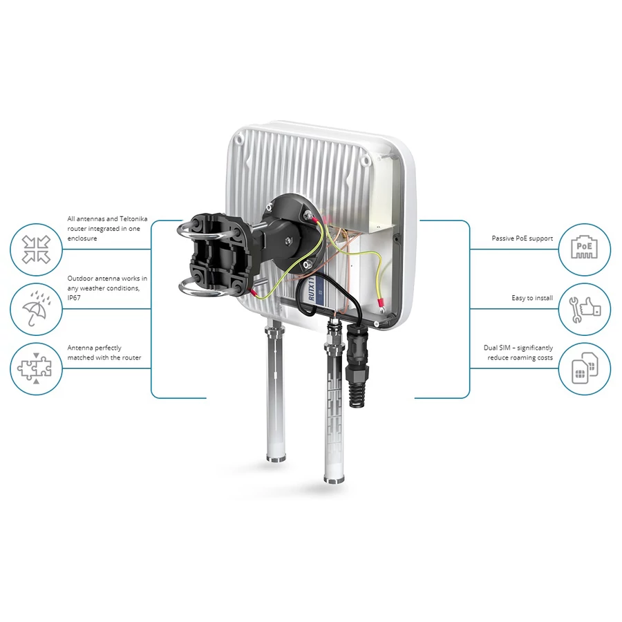 Minden egyben! IP67 Kültéri Integrált, LTE nagy teljesítményű irányított antenna + kültéri Wi-Fi kétsávos 2,4 és 5 GHz-es omni antenna + Bluetooth antenna + GPS antenna + Tokozat telepítési hellyel Teltonika RUTX11 routerkhez.