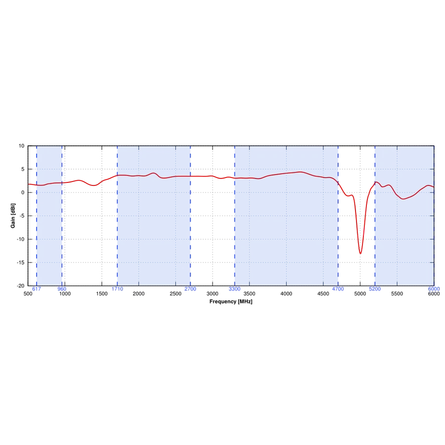 Antenna nyereség 617 - 960 MHz:3 dBi; 1.7 - 2.2 GHz:4 dBi; 3.3 - 4.7 GHz:4.5 dBi; 5.2 - 6.0 GHz:2.5dBi
