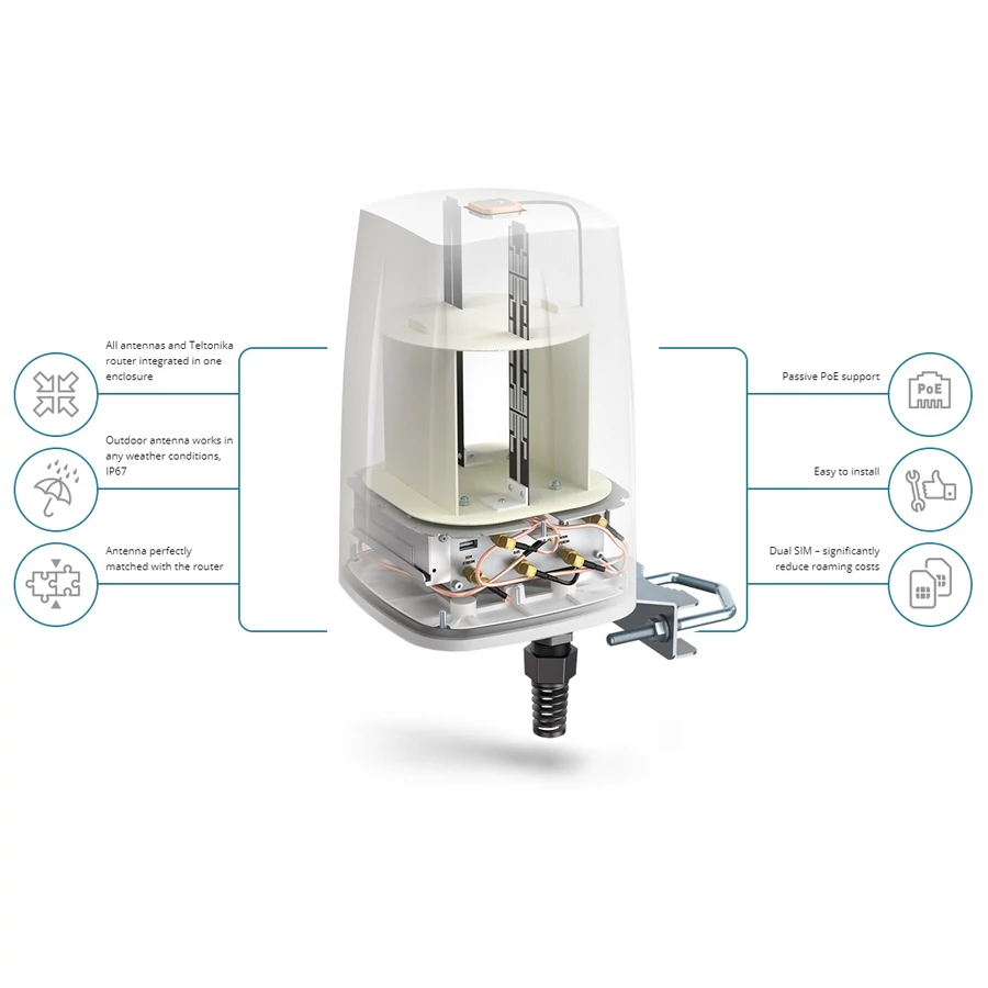 A Teltonika RUTX11 routerhez készült QuSpot LTE antenna egy tökéletes kültéri eszköz mobil és fix telepítésekhez, mint például ipari, CCTV, hotspotok, jachtok, csónakok, lakókocsik, lakóautók stb. Bluetooth antennával rendelkezik. Ha a RUTX11-et QuSpot antennával használja,egy integrált, teljes értékű megoldást kap, beágyazott routerrel és többsávos antennákkal egy házban.