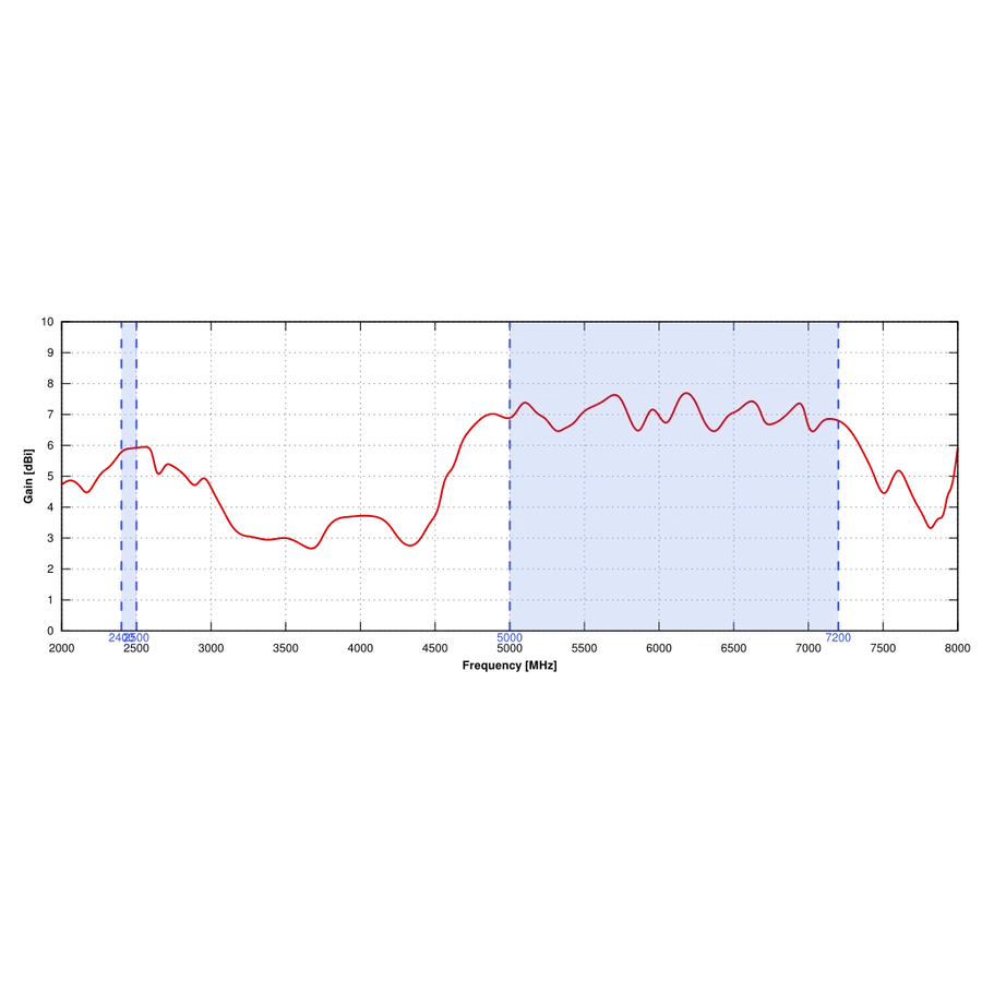 6 dBi (2.4 - 2.5 GHz), 7.5 dBi (5 GHz & 7 GHz) |