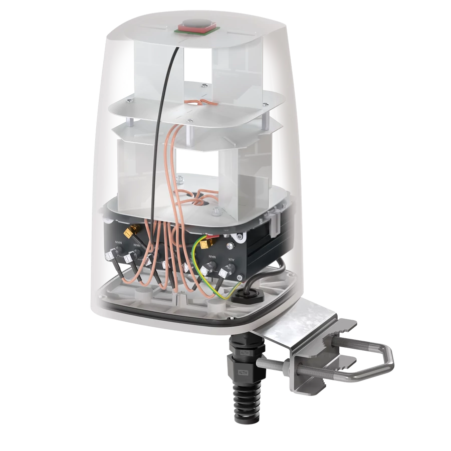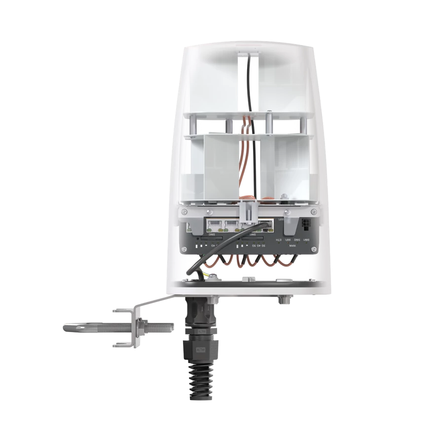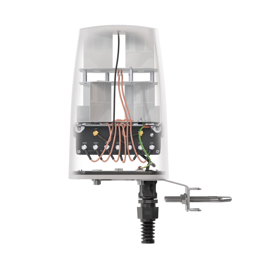 A QuSpot Teltonika RUTM56.hoz egy professzionális, integrált kültéri antennamegoldás, amelyet kifejezetten a Teltonika RUTM56 routerhez terveztek. Ez az „all-in-one” eszköz egyetlen, IP68 védettségű házban egyesíti a nagy nyereségű multi-band 5G/LTE, a kétsávos Wi-Fi és a GPS antennákat, miközben belső teret biztosít a router biztonságos elhelyezésére. A megoldás minimalizálja a jelveszteséget és maximalizálja az adatátviteli sebességet zord ipari vagy mobil környezetben is.