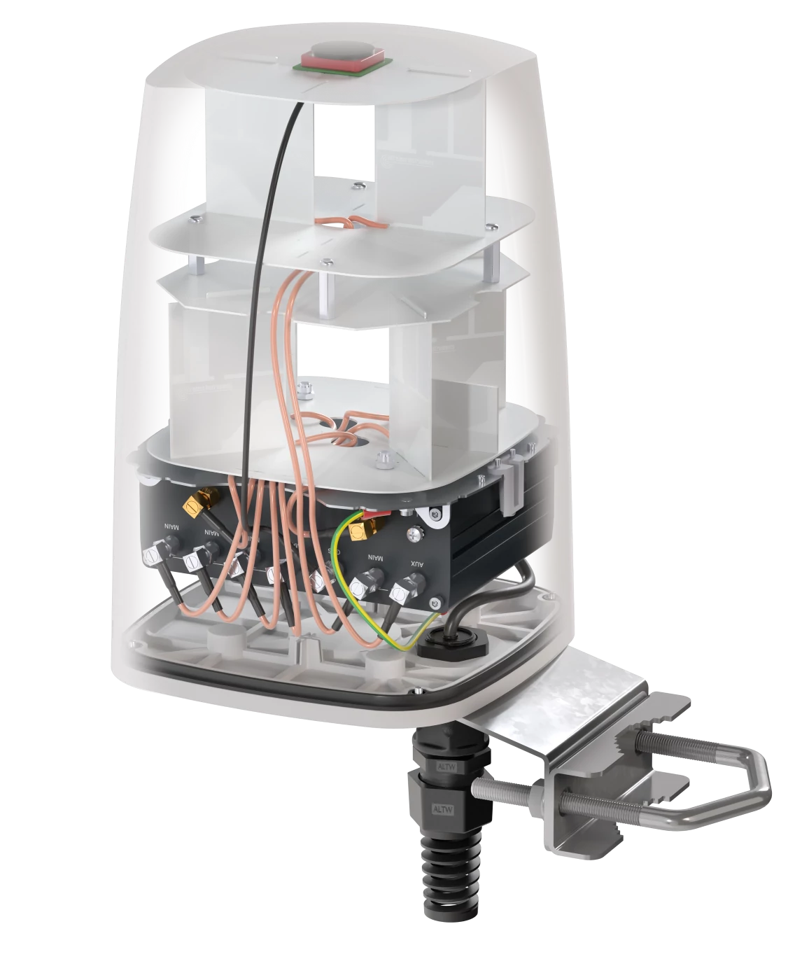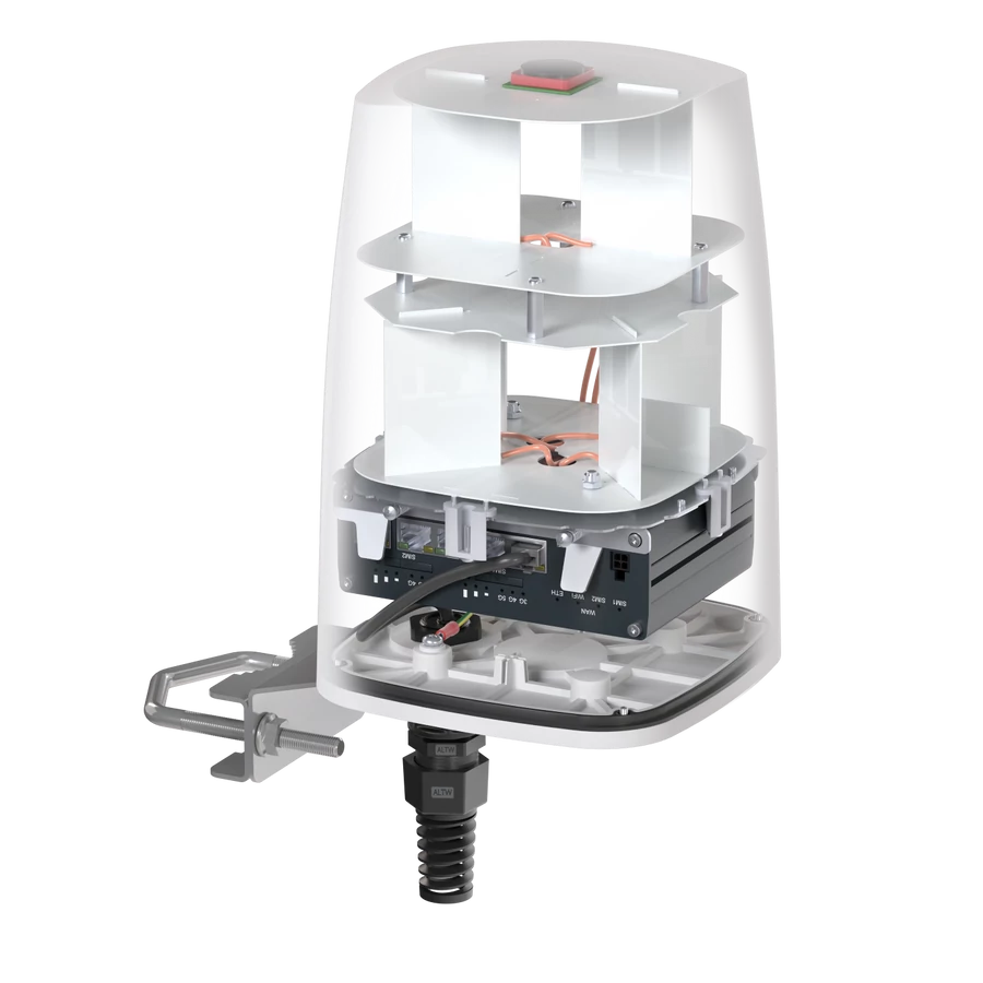 Integrált kialakítás: Nincs szükség külön antenna- és routerházra, minden egyetlen kompakt egységben (160 x 160 x 240 mm).