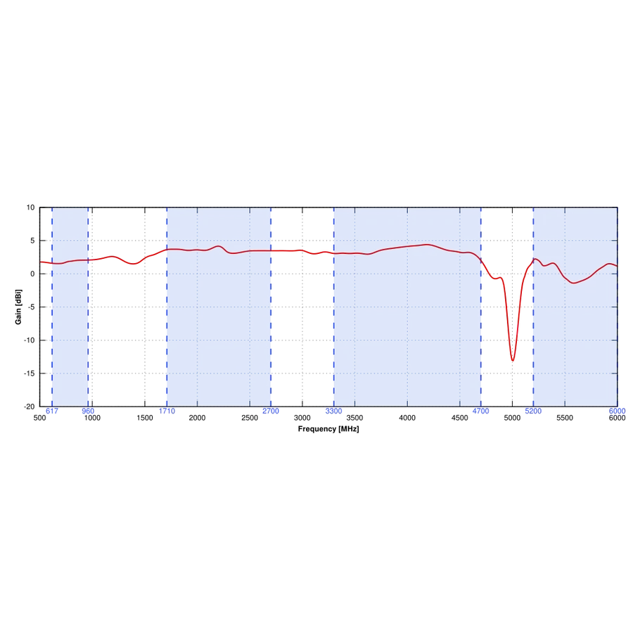617 - 960 MHz:2 dBi, 1,7 - 2,7 GHz:4 dBi, 3,3 - 4,7 GHz:4,5 dBi, 5,2 - 6,0 GHz:2 dBi |