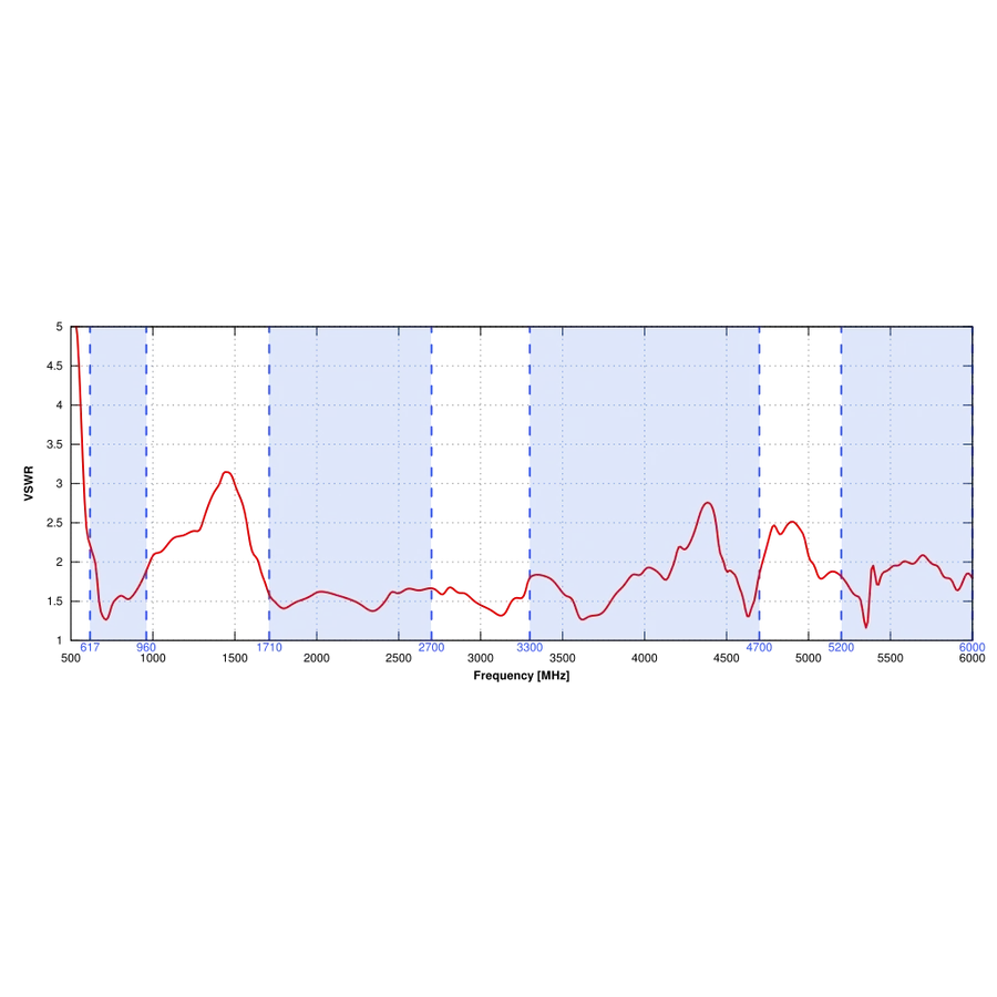 617 - 960 MHz, 1,7 - 2,7 GHz, 3,3 - 4,7 GHz, 5,2 - 6,0 GHz |