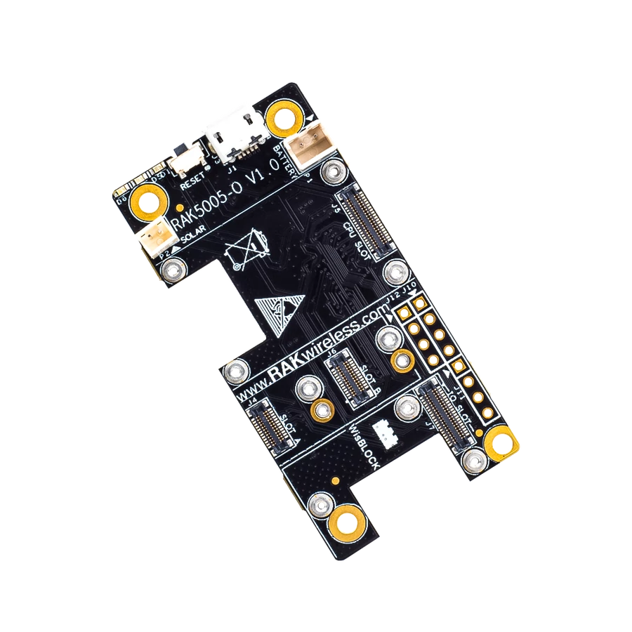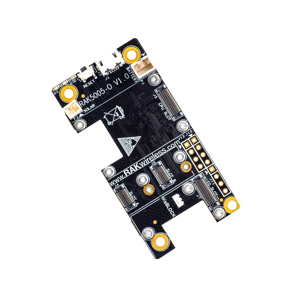 A WisBlock alaplap (RAK5005-O) a RAK WisBlock alapblokkja. Ez a hordozója a WisBlock Core MCU modulnak és a WisBlock érzékelőknek és más WisBlock típusú moduloknak.