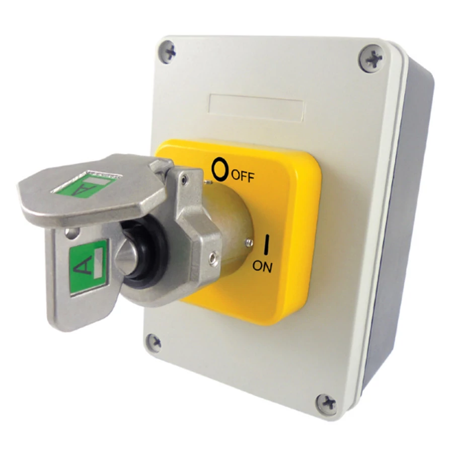 Kialakítás: Rozsdamentes acél kulcsszerkezet és polycarbonát elektromos tokozat. 63A 4P kapcsoló