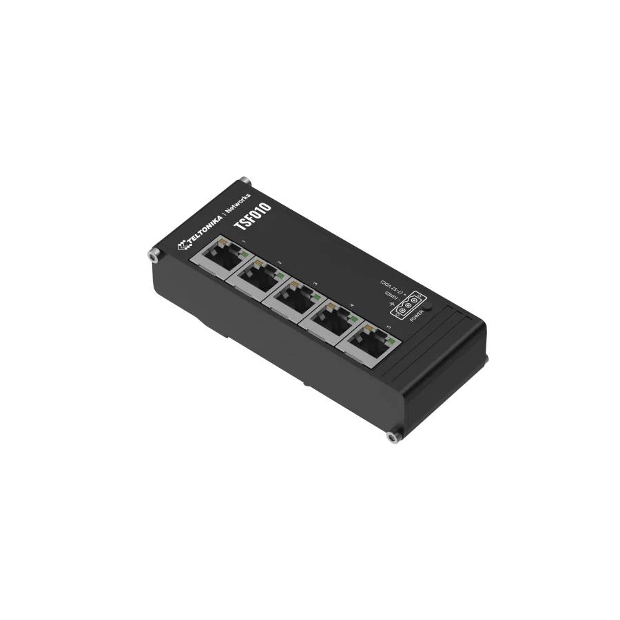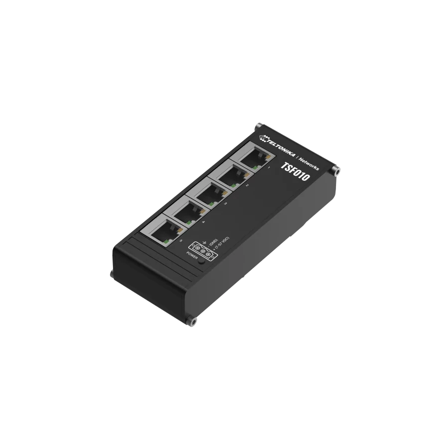 A Teltonika Networks TSF010 egy nem menedzselt Ethernet switch, amely lapos kialakítással és integrált DIN-sínes rögzítővel rendelkezik, ezáltal alkalmas az ipari kapcsolószekrényekbe történő egyszerű integrálásra. Ez az Ethernet switch kompakt és könnyű, mérete 113 x 28 x 50 mm, súlya pedig mindössze 142 g. 3 pólusú tápbemenetének és 7-57 VDC feszültségtartományának köszönhetően rugalmas a felhasználhatósága.  A TSF010 öt 10/100 Mbps RJ45 porttal van felszerelve a megbízható csatlakozás érdekében. A TSF010 ipari felhasználásra tervezett switch segítségével segítségével költséghatékonyan növelhető az Ethernetes hálózati csatlakozások száma.