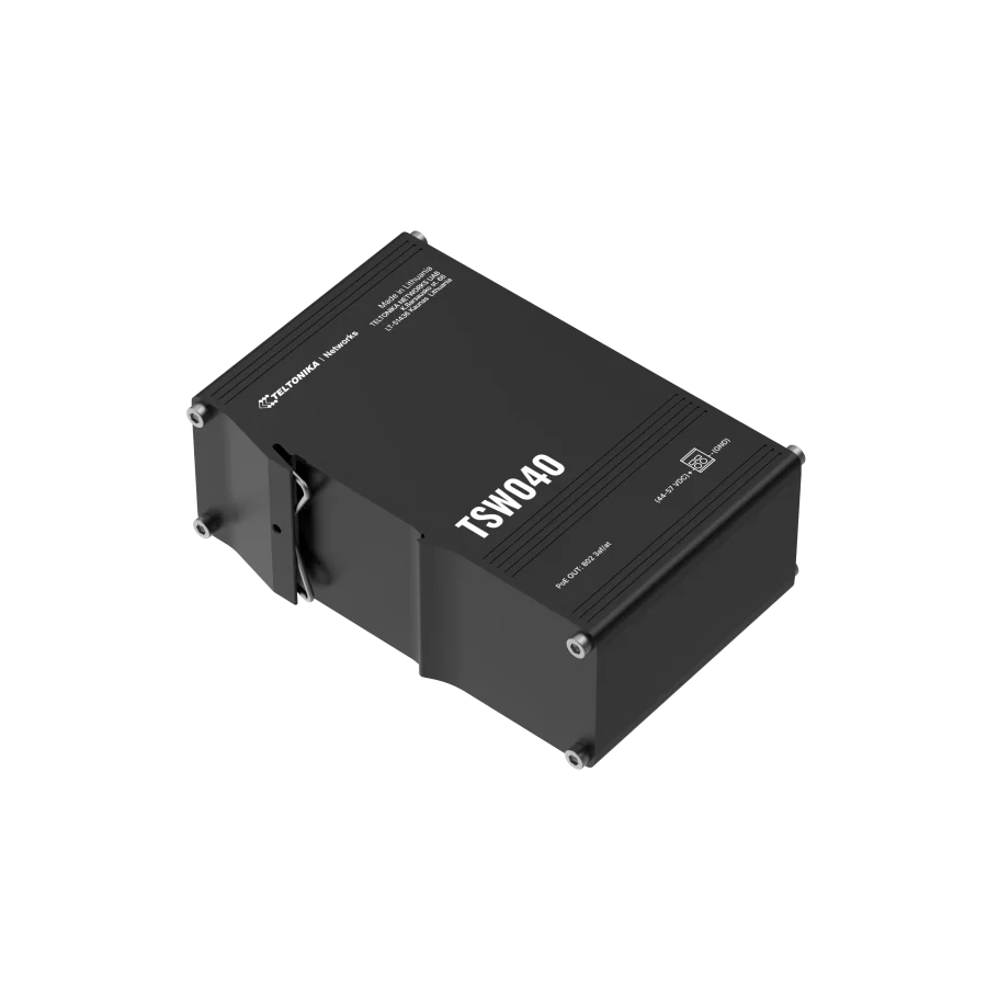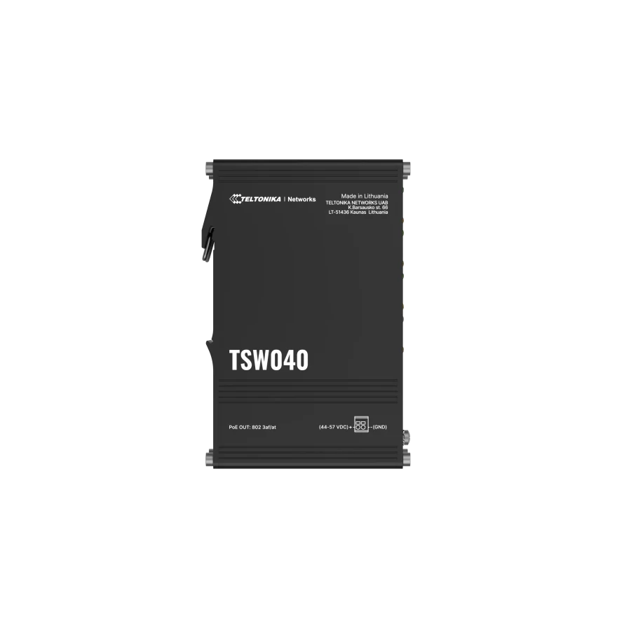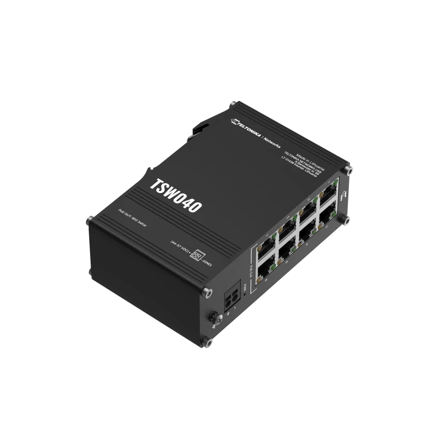 A Teltonika TSW040 egy nem menedzselhető 8 portos PoE+ switch amelyek teljes teljesítménye 240 W, vagy portonként akár 30 W. Ez a kompakt és robusztus 8 portos kapcsoló 2 pólusú tápbemenettel és integrált DIN-sínes rögzítővel is rendelkezik az egyszerű felszerelés érdekében, így ideális ipari alkalmazásokhoz. A TSW040 széles feszültségtartománya 7-57 VDC vagy PoE-out használata esetén 44-57 VDC.